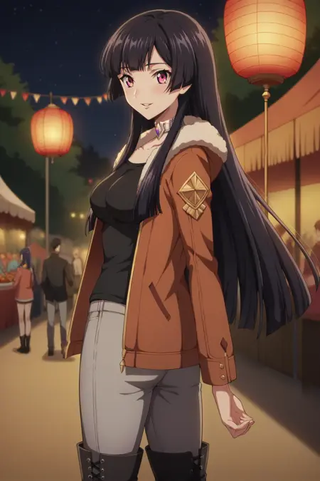 Outfit shown in original ep: black shirt, open jacket, brown fur trim jacket, black thigh boots, grey pants