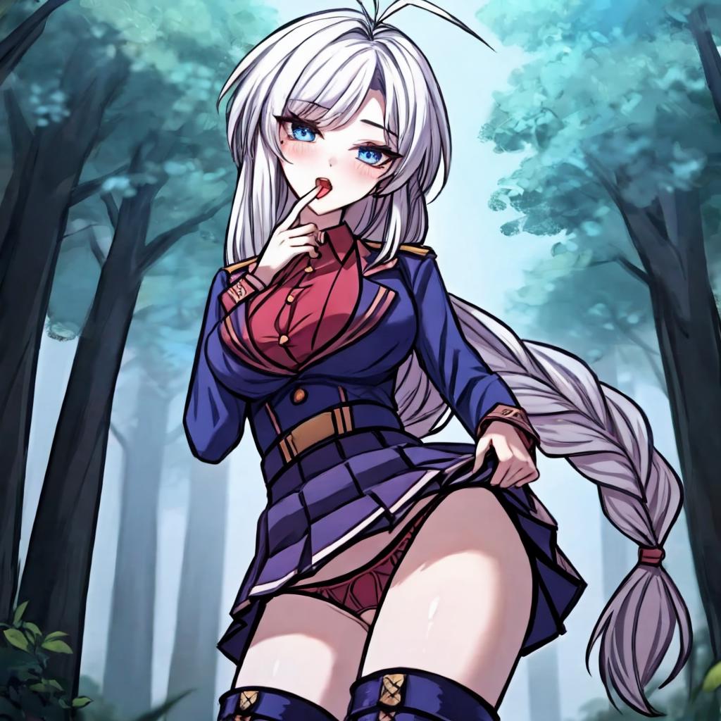 | 训练词汇 | dong qing xue, long hair, white hair, antenna hair, bangs, parted bangs, very long hair, braided ponytail, blue eyes, military uniform, blue jacket, collared shirt, red shirt, blue microskirt, pleated skirt, belt, black footwear, high heel thigh boots,已复制! |