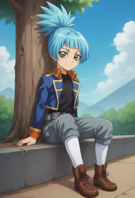 sora, 1boy, 男性焦点, 单人, 绿色眼睛, 蓝色头发, 刘海, 齐刘海, 马尾, 衬衫, 黑色衬衫, 夹克, 蓝色夹克, 长袖, 开襟夹克, 露出衣物, 腰带, 短裤, 灰色短裤, 连裤袜, 白色连裤袜, 靴子, 棕色鞋子,