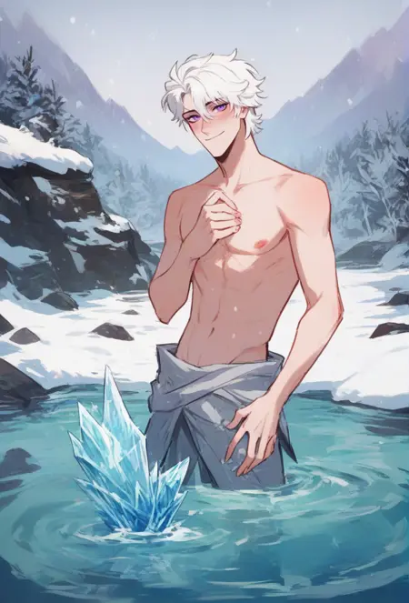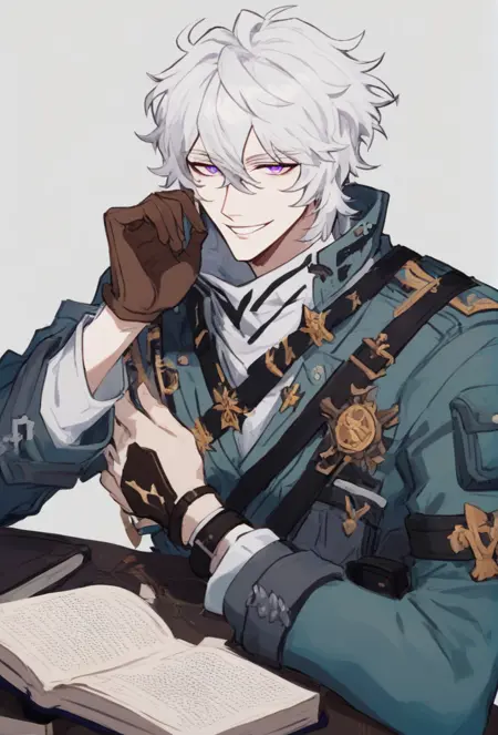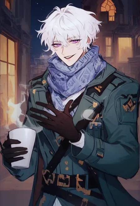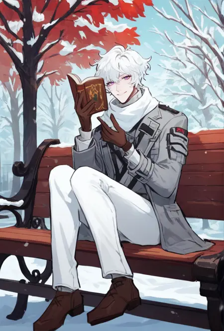 grey jacket, white pants, brown gloves, brown footwear, white scarf