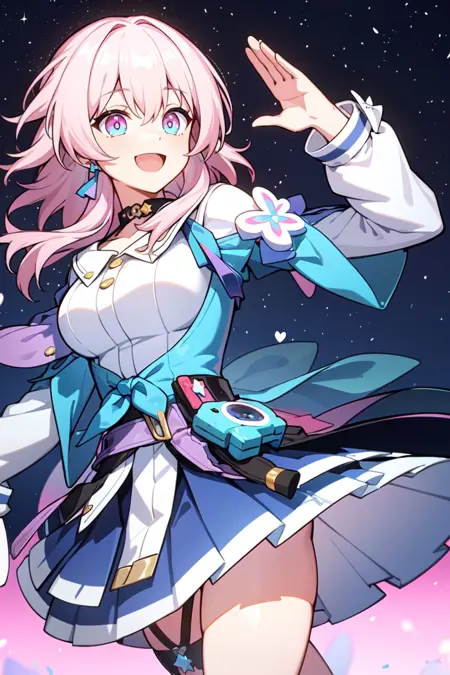 그녀를 소환하려면 아래 태그에 트리거 태그를 추가하세요: 1girl, solo, 분홍 머리, 앞머리, 관객을 바라보는, 미소, 긴 소매, 하얀 셔츠, 벌린 입, 파란 눈, 파란 자켓, 치마, 가슴