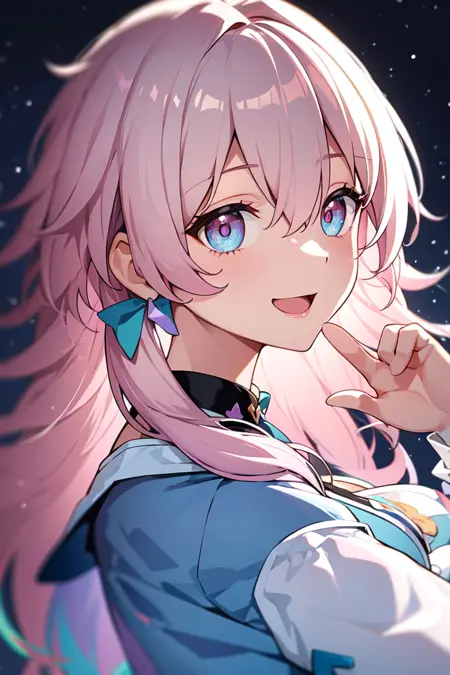要召唤她,请使用触发标签,并加上以下标签:1girl, solo, pink hair, bangs, looking at viewer, smile, long sleeves, white shirt, open mouth, blue eyes, blue jacket, skirt, breasts