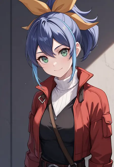 celina, 1girl, ソロ, 緑の目, 青い髪, 二色髪, ヘアボウ, ポニーテール, 白いセーター, チュニック, 黒いシャツ, 赤いジャケット, 短めのジャケット, 開いたジャケット, ジュエリー, ブレスレット, ベルト, スカート, 灰色のスカート、