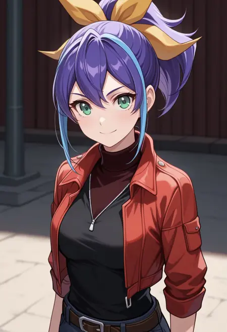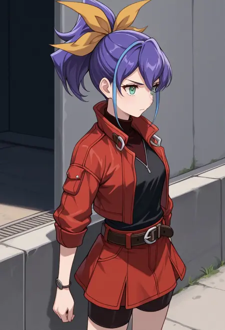 celina, 1girl, ソロ, 緑の目, 紫の髪, 青い髪, 二色髪, ヘアボウ, ポニーテール, 赤いセーター, チュニック, 黒いシャツ, 赤いジャケット, 短めのジャケット, 開いたジャケット, ベルト, スカート, 赤いスカート, バイクショーツ, ブーツ,