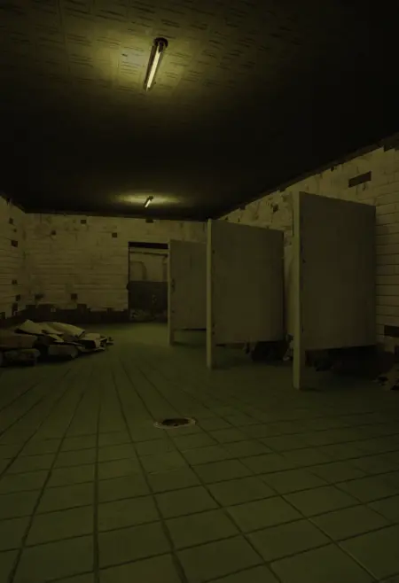 indoors, horror \(theme\), dark, abandoned, underground, tunnel, concrete walls, peeling paint, dirty floor, cracked floor, fluorescent light, dim lighting, decayed, damaged walls, neglected, concrete floor, shadows, urban decay