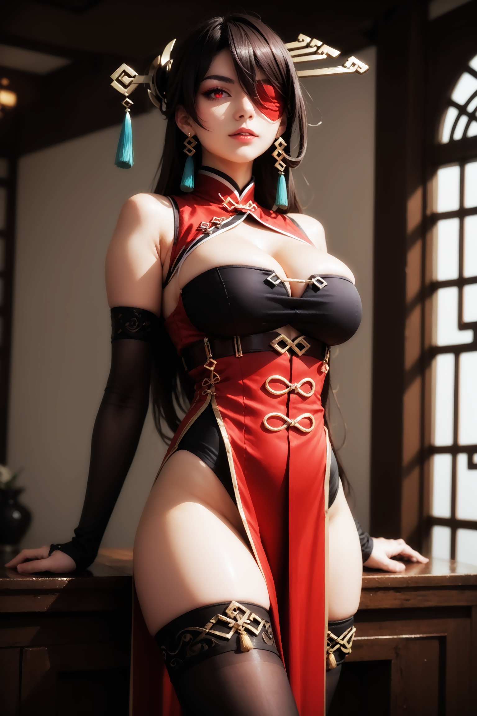 의상 프롬프트 : pelvic curtain, hair ornament, eyepatch, earrings, hairpin, black gloves, cleavage, thigh boots, dress, fingerless gloves, hair stick, one eye covered, fur trim, bare shoulders, chinese clothes, vision (genshin impact), red capelet, cleavage cutout, elbow gloves