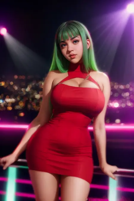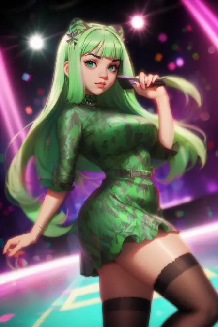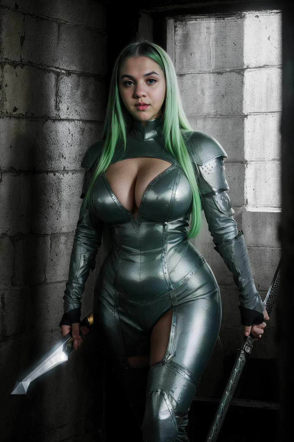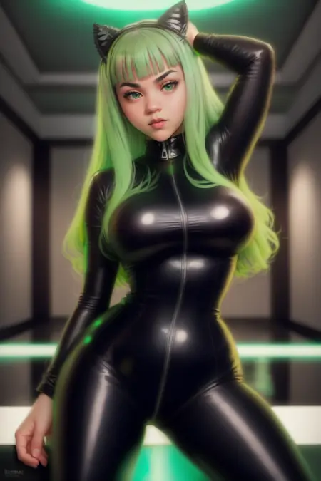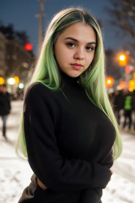 这是实验系列中的另一个作品,原本试图创造一个完全不漂亮的人,再通过面部替换将其移植到数据集中。想法是经典的“美人鱼身”角色——即“脸丑但身材好”的类型。但和往常一样,Reactor 的面部替换把她变成了一个漂亮得多的角色。虽然仍不如许多角色那么迷人,但还是比我预期的要好得多。至少它保留了她绿色的头发。