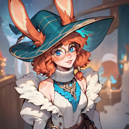 round glasses, witch hat, sleeveless sweater, white jacket with fur, white fingerless gloves, rope belt, blue shorts, thighhighs,