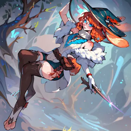 옷: 둥근 안경, 마녀 모자, 소매 없는 스웨터, 털이 있는 흰 재킷, 흰색 지手套, 로프 벨트, 파란색 반바지, 허벅지까지 오는 양말,