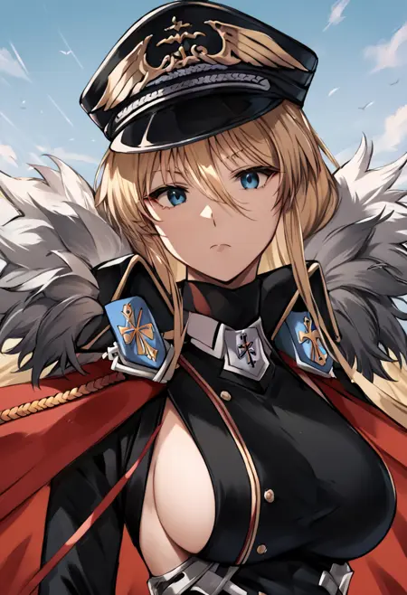 bzw, 1girl, bismarckzweia, solo, long hair, breasts, l blue eyes, blonde hair, large breasts, krs_hat, hair between eyes, upper body, krsw_uniform, cape, coat, fur trim, military, sideboob,