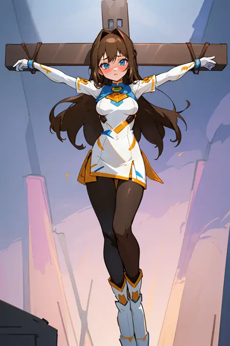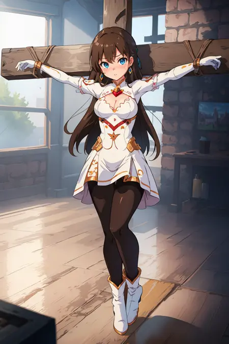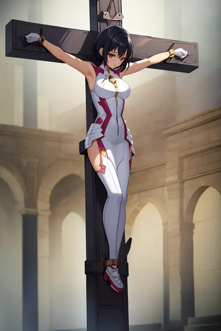 閉じた目、へそ、乳首、素足、裸、陰部、破れた服、鎖、手錠、負傷、打撲、完全な裸、ロープ、血液、縛られた足首、空、上半身裸、わきの下