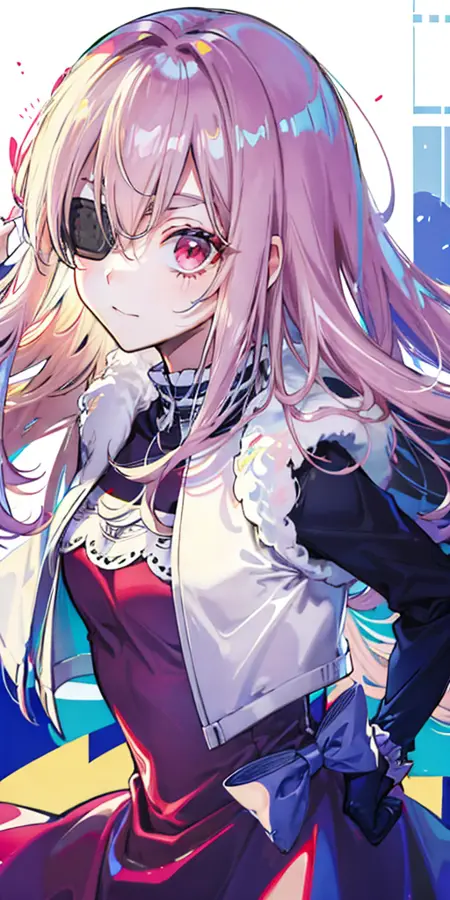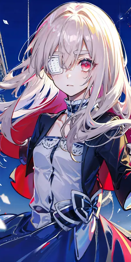 シーズン6(カジノシーン)スタイル衣装: medical eyepatch, missing limb, missing arm, white jacket, tied jacket, red dress, frilled dress, lace gloves