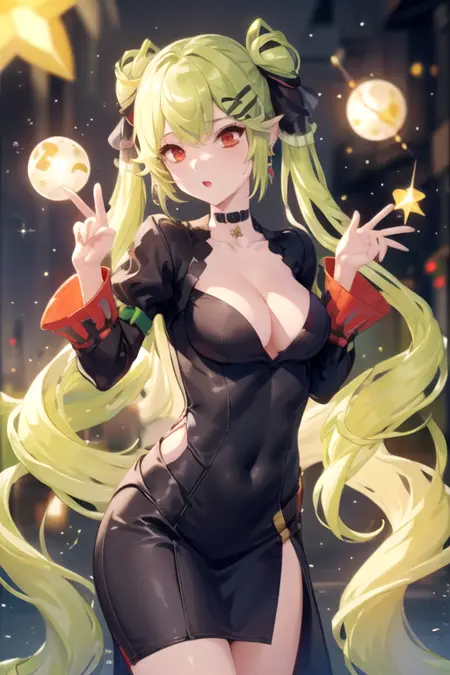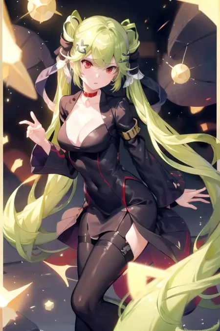 DisciplineEnforcerA1, 1girl, solo, very long hair, green hair, red eyes, cleavage, twintails, medium breasts, collarbone, hair ribbon, choker, hair ornament, black dress, earrings