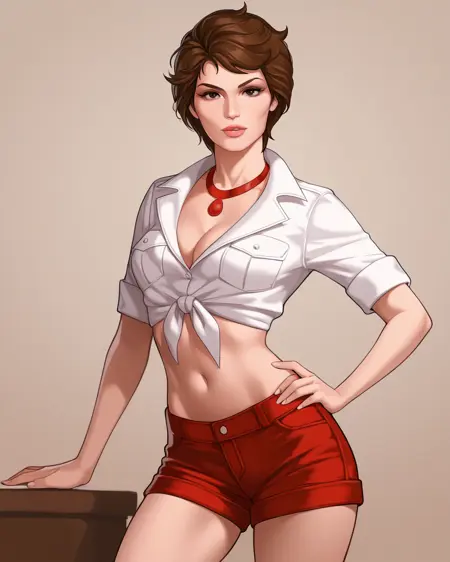 - ladyjaye, rah, 短发, 棕发, 嘴唇, 白色短上衣, 系扣衬衫, 挺胸, 腹部, 肚脐, 红色短裤, 红色项链