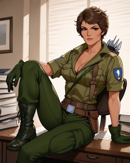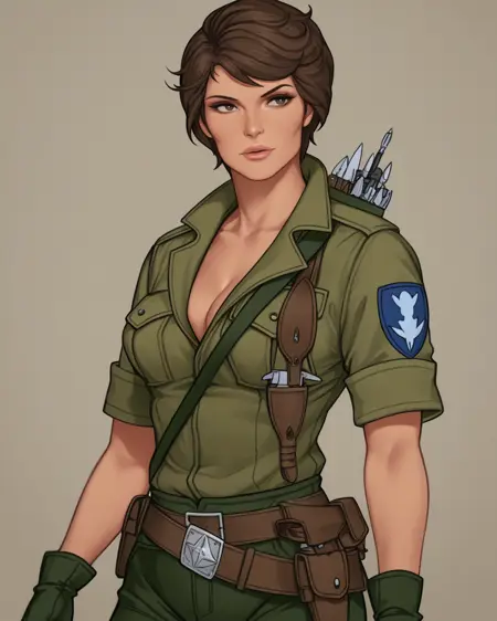 - ladyjaye, rah, 短发, 棕发, 嘴唇, 橄榄色制服, 开领, 短袖, 刀鞘, 标枪箭袋, 游骑兵徽章, 皮带, 裤子