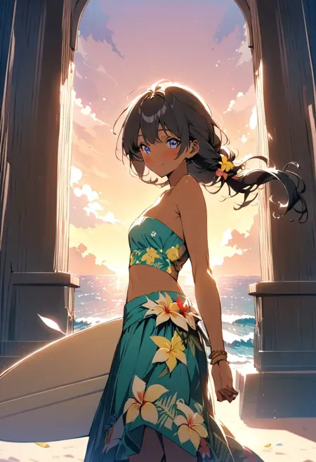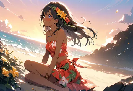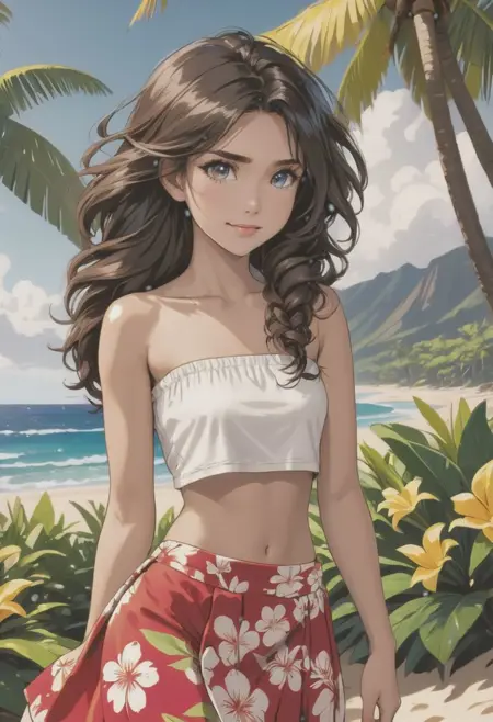 我通常使用的提示顺序为:(夏威夷服饰,热带印花红色短款上衣,及膝绿色草裙,赤脚,紧致露腹,头发上佩戴红色热带花朵,花环项链)