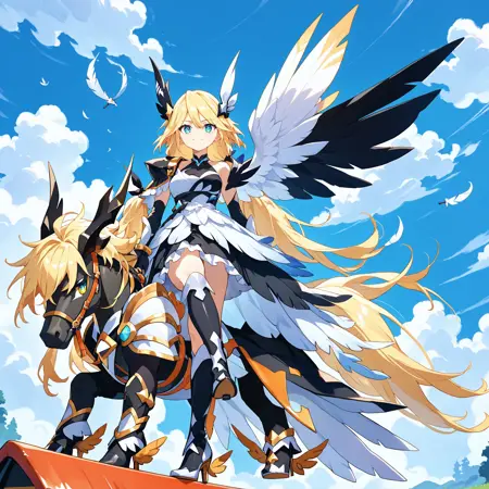 DiaboliqueOrigin: dorigin, horns, multicolored dress, halterneck, white dress, black dress, sleeveless, shoulder armor, feathers, black gloves, knee boots, multicolored boots, heels,