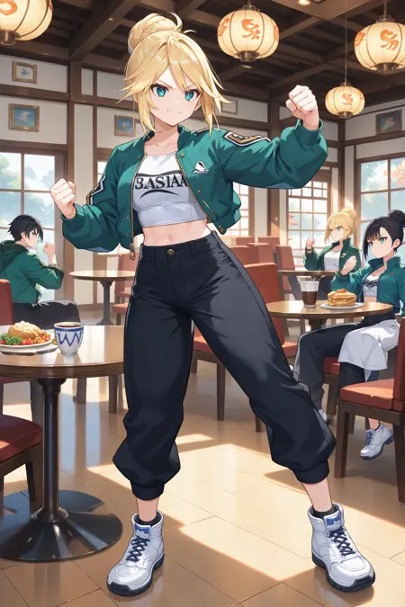 HolidayCasual(AO): aocasual, green jacket, long sleeves, open jacket, white shirt, crop top, navel, black pants, white footwear, sneakers,