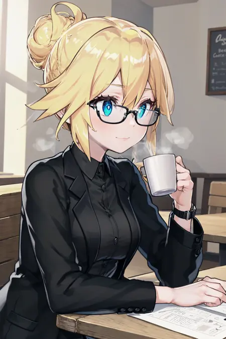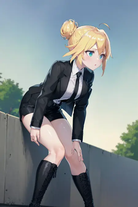 HolidayCasual: hcasual, 单发髻,黑色夹克,长袖,敞开式夹克,白衬衫,有领衬衫,黑色领带,领带夹,黑色短裤,及膝靴,交叉系带鞋