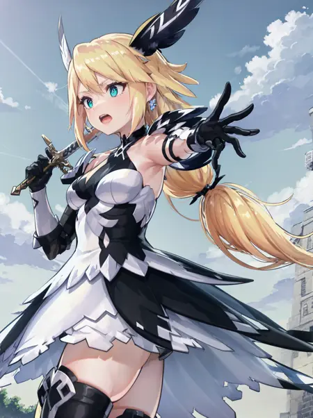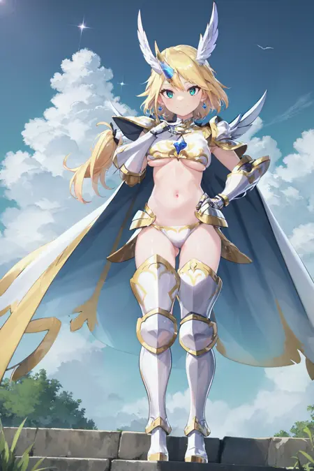 Magica2020Evo(AO): magica2020, 头部翅膀,单角,耳环,比基尼装甲,白色装甲,胸甲,露脐,珠宝,肩甲,白色斗篷,护手,装甲靴,高跟鞋