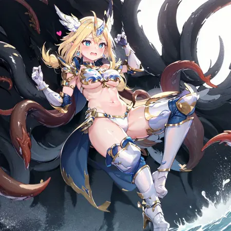 Magica2020Evo(AO): magica2020, head_wings, single horn, earrings, bikini armor, white armor, breastplate, underboob, jewelry, shoulder armor, white cape, gauntlets, armored boots, heels