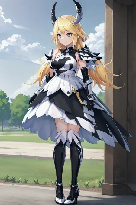 DiaboliqueOrigin: dorigin, horns, multicolored dress, halterneck, white dress, black dress, sleeveless, shoulder armor, feathers, black gloves, knee boots, multicolored boots, heels,