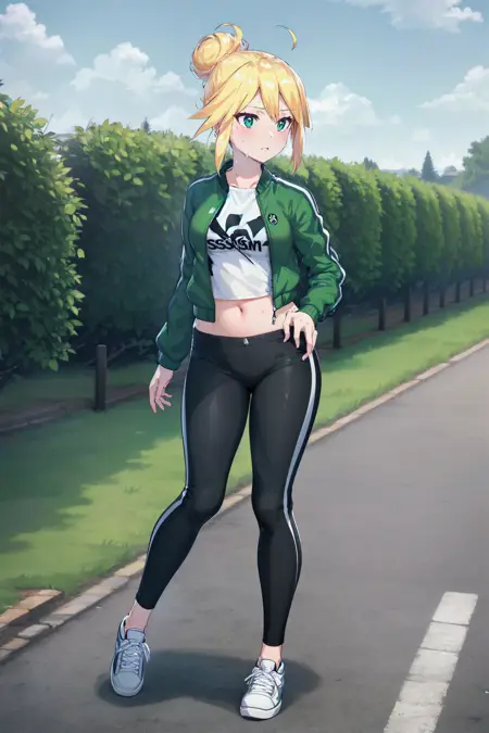 HolidayCasual(AO): aocasual, 绿色夹克,长袖,敞开式夹克,白衬衫,短上衣,肚脐,黑色长裤,白色鞋履,运动鞋,