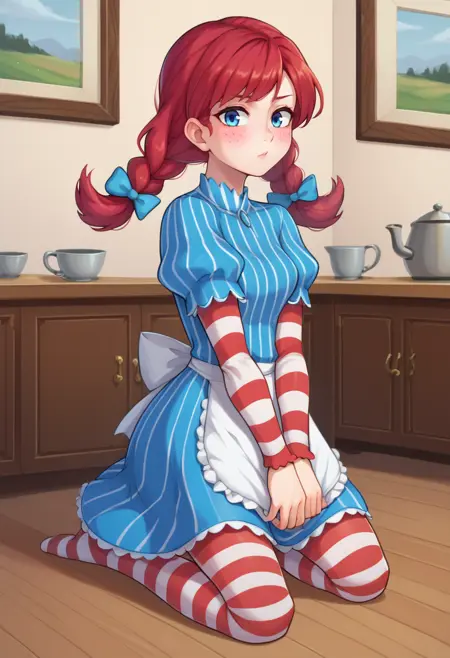 wendysSDXL,1girl,blue eyes,long sleeves,dress,bow,twintails,braid,short sleeves,hair bow,striped pantyhose,red hair,striped,puffy sleeves,apron,twin braids,vertical stripes,freckles,striped dress,blue dress