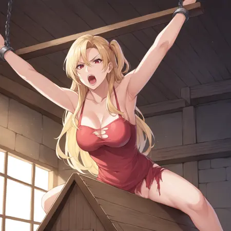 score 9, score 8 up, score 7 up, (source anime), 1girl, bdsm, green hair, high ponytail, blue eyes, solo, torn clothes, bottomless, pussy, pussy juice, sts_suspension, from below, bondage, bound, red rope, suspension, hanging, (arms up, legs up, legs together), dungeon, highres, absurdres, masterpiece, best quality, ultra-detailed, illustration,colorful, masterpiece, best quality, ray tracing, 8k, extremely detailed, soft lighting, tracing, soft shadows, detailed face, ->LORA-GOES-HERE<-