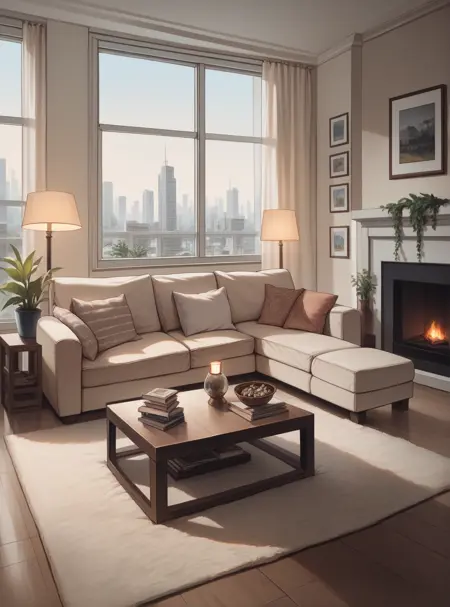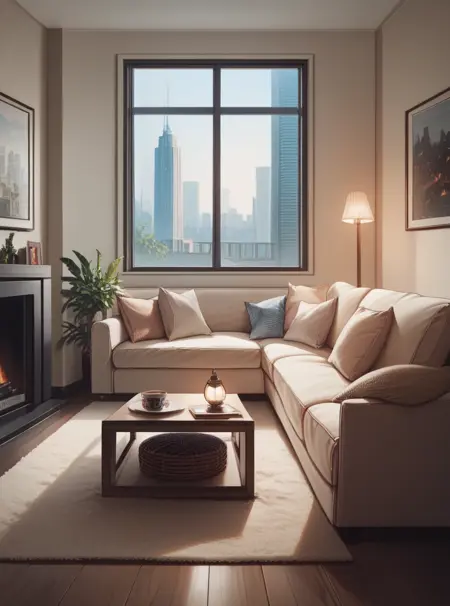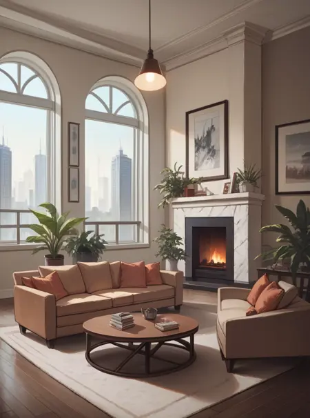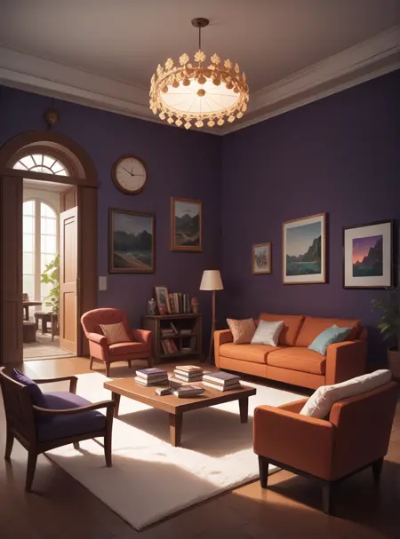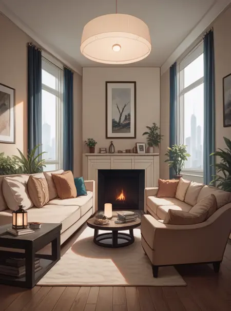 此LoRA将生成各种现代客厅。结果可能因模型而异。