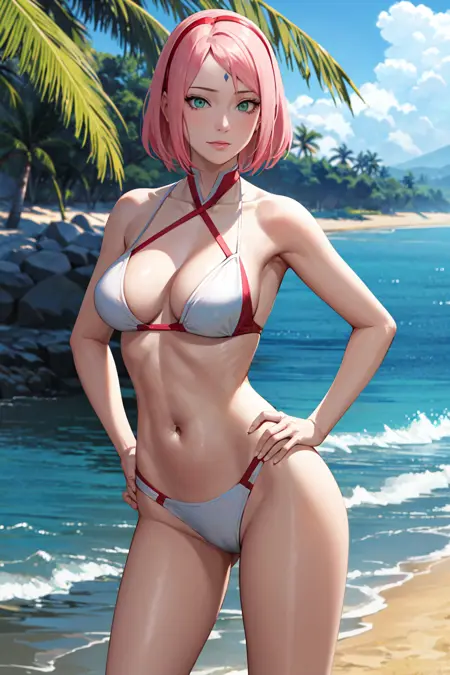 masterpiece, absurdres ,1girl, haruno sakura,forehead mark, red hairband, red sleeveless dress, navel, white pants, bracelet, cowboy shot, outdoors, looking at viewer, smile