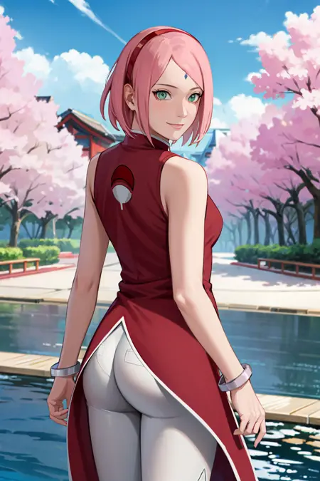 masterpiece, absurdres ,1girl, haruno sakura,forehead mark, red sleeveless dress ,red hairband, bracelet, white pants, from behind, uchiha crest, looking at viewer, looking back, outdoors