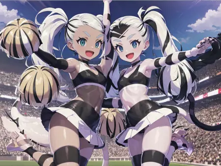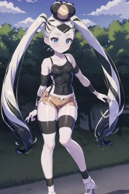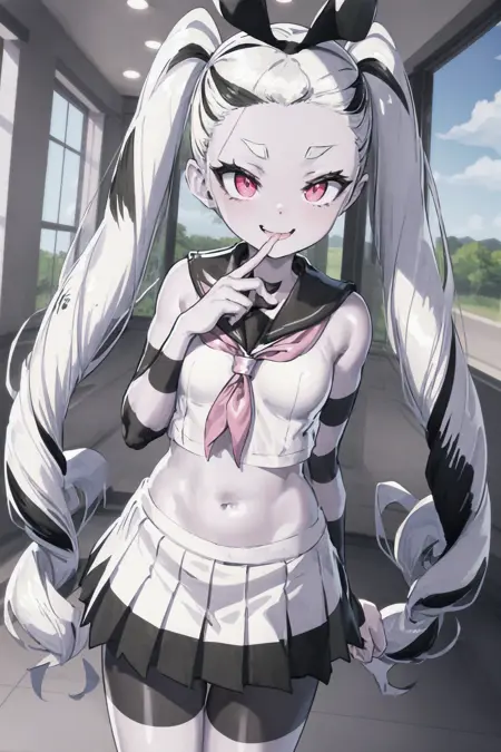 trigger: nymph, pale skin, twintails, forehead, long hair, two-tone hair, bodypaint, striped