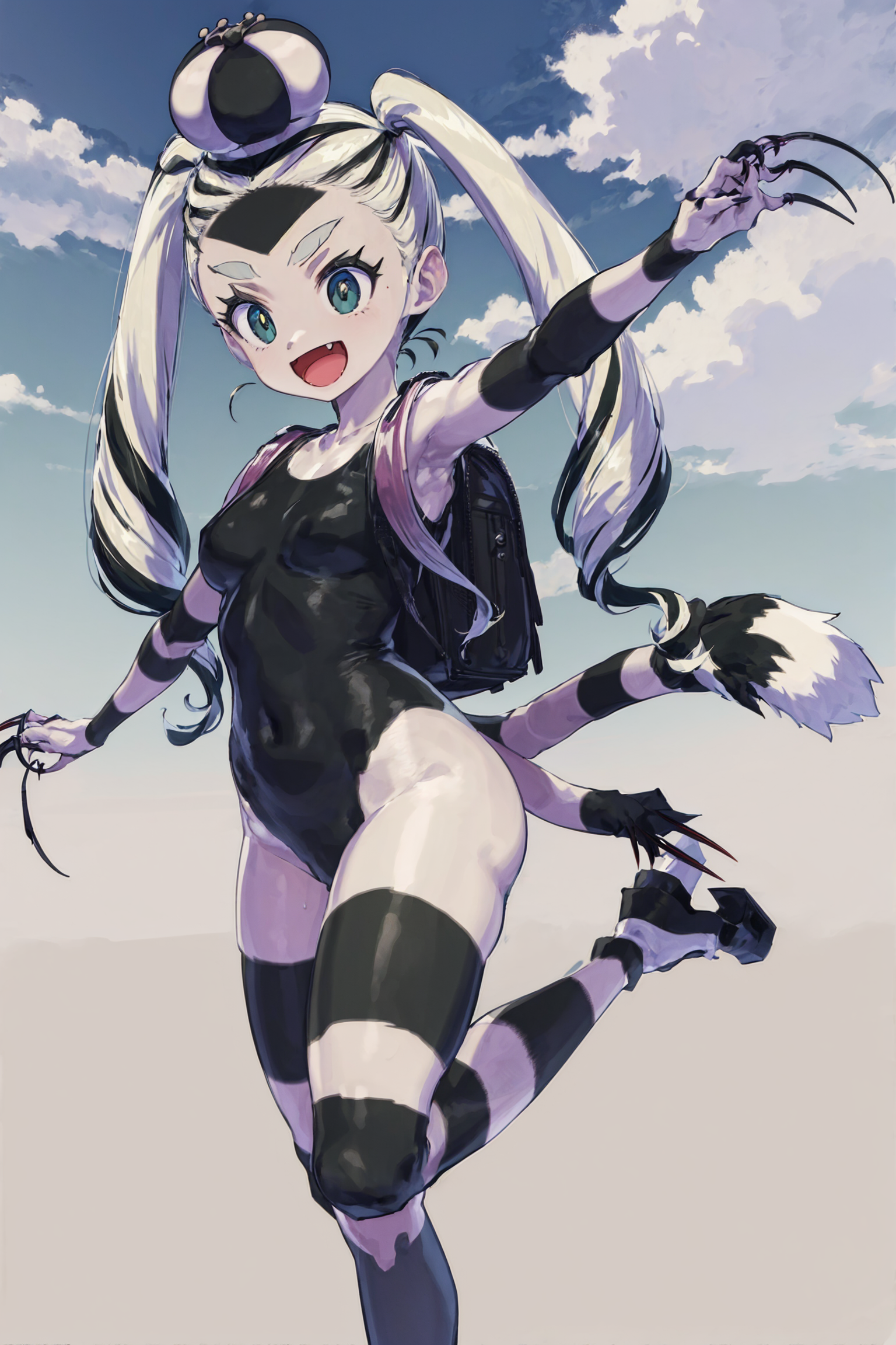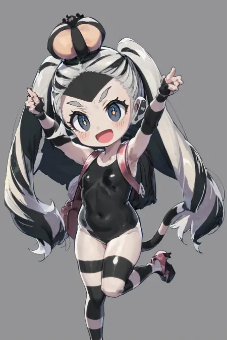 trigger: nymph, (grey skin:1.4), twintails, forehead, long hair, two-tone hair, bodypaint, striped