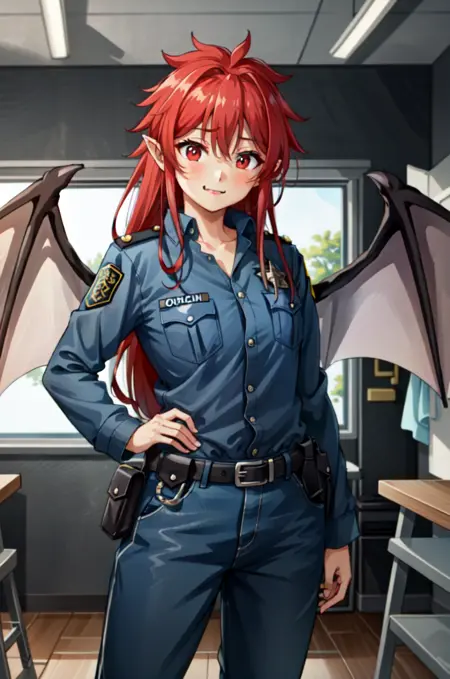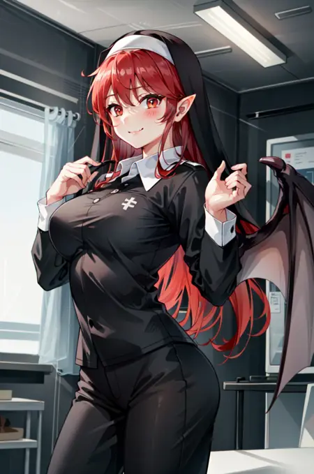 MariSetogoya, 1girl, long hair, red eyes, red hair, wings, pointy ears, fang, bat wings, demon wings, (your outfit:1.1)