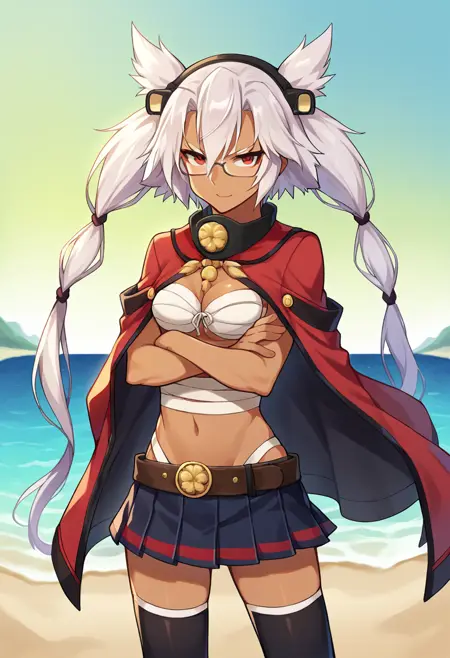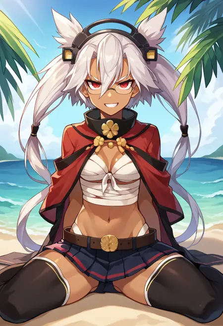 Main Tags - 1girl, solo, long silver hair, twin tails, red eyes, dark skin, headgear, glasses, red capelet, budget sarashi, belt, black pleated miniskirt, black thighhighs