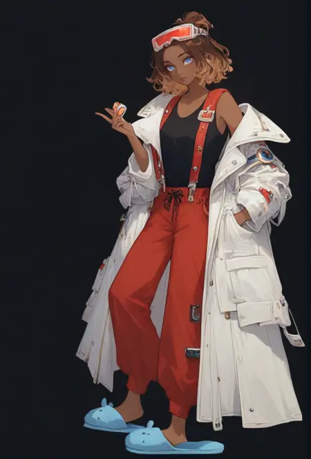 slippers, red pants, black tank top, white coat, off shoulder, suspenders