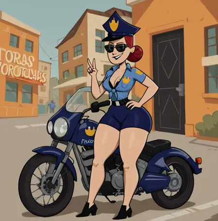 1girl, officerj0nes, thick thighs, red hair, policewoman, hat, pants, shoes,