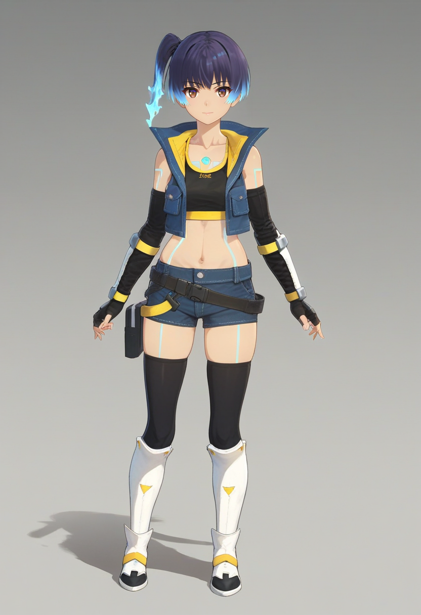 休闲装,短夹克,牛仔短裤,运动内衣,黑色无指手套,臂护,黑色过膝袜,膝靴,腰包,黑色内裤
