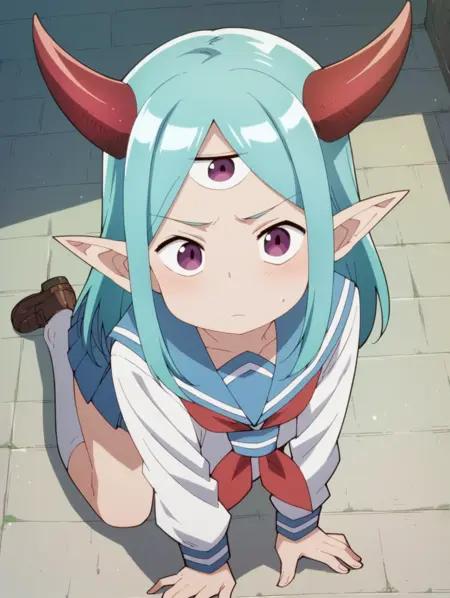 lv1maou_b, horns, pointy ears, aqua hair, purple eyes,
