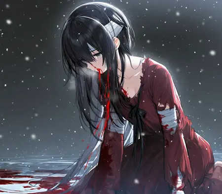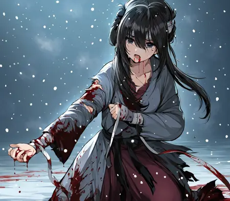 mansui,1girl,solo,black hair,long hair,bangs,bandages,long sleeves,grey eyes,bandaged arm,torn clothes,collarbone,sidelocks,bandaged head,mole under eye,hair between eyes,grey dress,