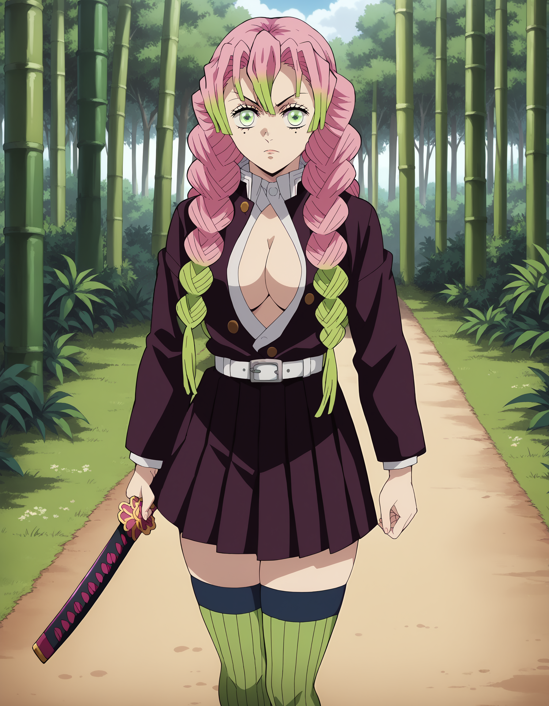 衣装: ベルト,鬼滅の刃の制服,プリーツスカート,緑のタイツ,サンダル,リブ編みの脚韻,黒いスカート,長袖,ジャケット,一部ボタンが外れた状態,日本の衣装,白いパンツ,黒いジャケット,羽織,