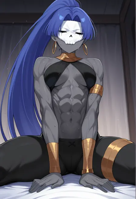 显著标签: 非常深的肤色、有色皮肤、灰色皮肤、非常长的头发、蓝色头发、马尾辫、黑色眼睛、微张的嘴唇、圆环耳环、颈圈、臂环、手镯、紧身裤、腹肌、肌肉女性