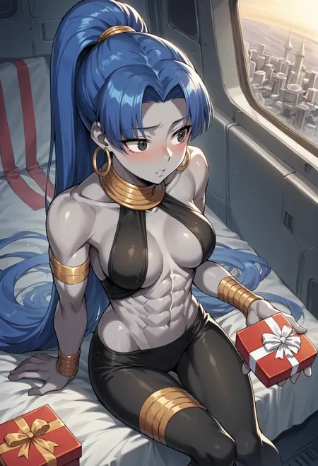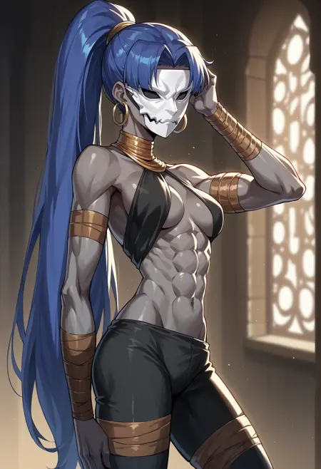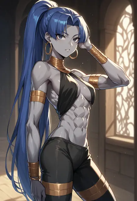 注目タグ: 非常に濃い肌色、色のある肌、灰色の肌、非常に長い髪、青い髪、ポニーテール、黒い目、開いた唇、リング型の耳飾り、首輪、腕輪、ブレスレット、レギンス、腹筋、筋肉質な女性