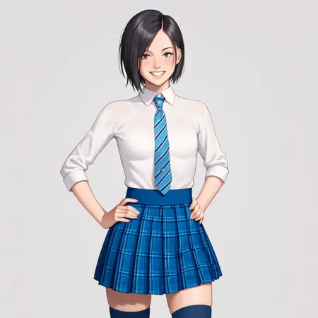 학교 유니폼 - 흰 셔츠, 줄무늬 넥타이, 파란 치마, 체크 치마, 허벅지 길이 양말 (이 옵션은 그녀의 재킷 없이 생성되도록 합니다. 그러나 약간 불안정할 수 있습니다)