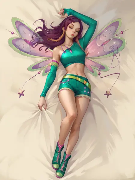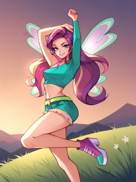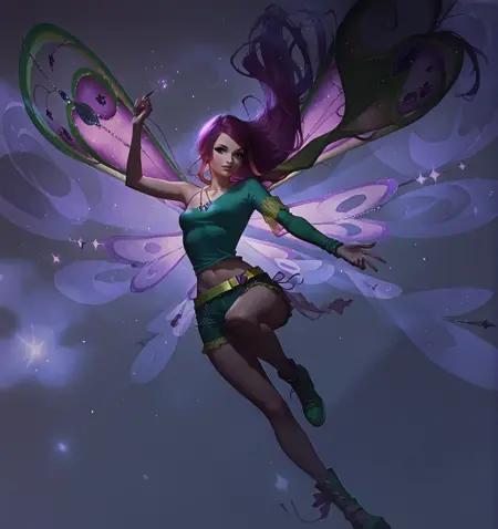 Roxy, 1girl, solo, long purple hair, green shirt with one with one sleeve, pink and green wings, green shorts, yellow belt, green shoes
