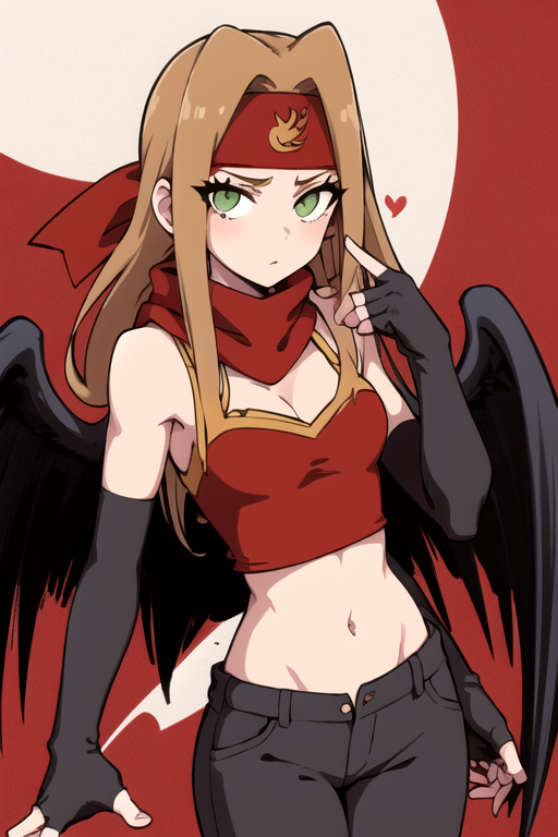 Fl4megirl, 1girl, solo, long hair, brown hair, black gloves, navel, cleavage, medium breasts, green eyes, black wings, midriff, black pants, fingerless gloves, red crop top, headband, hair intakes, elbow gloves, bandana