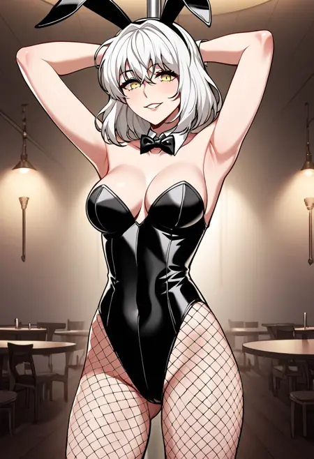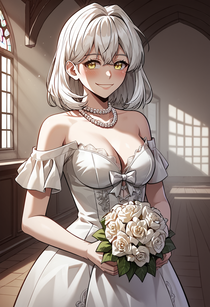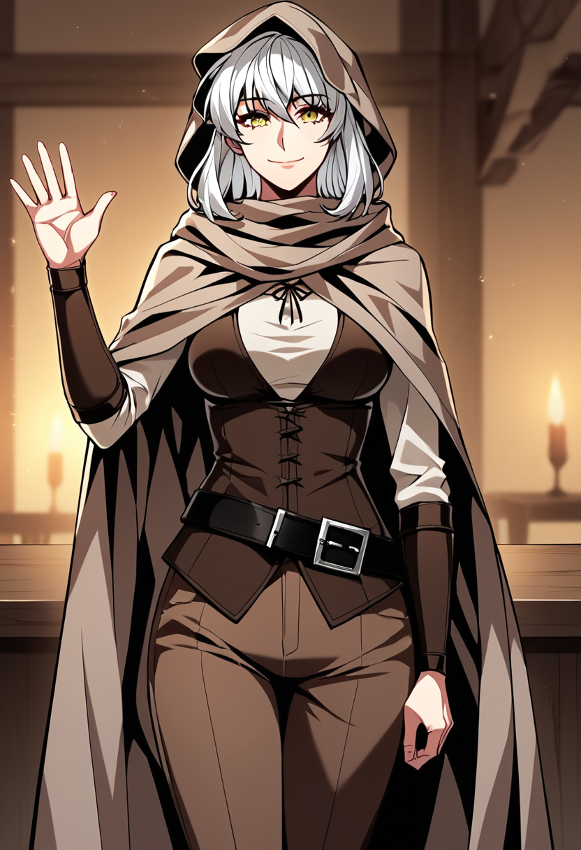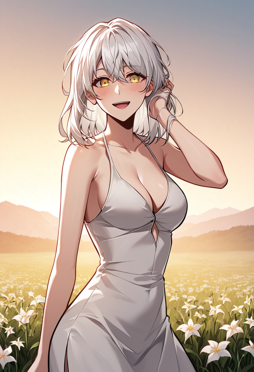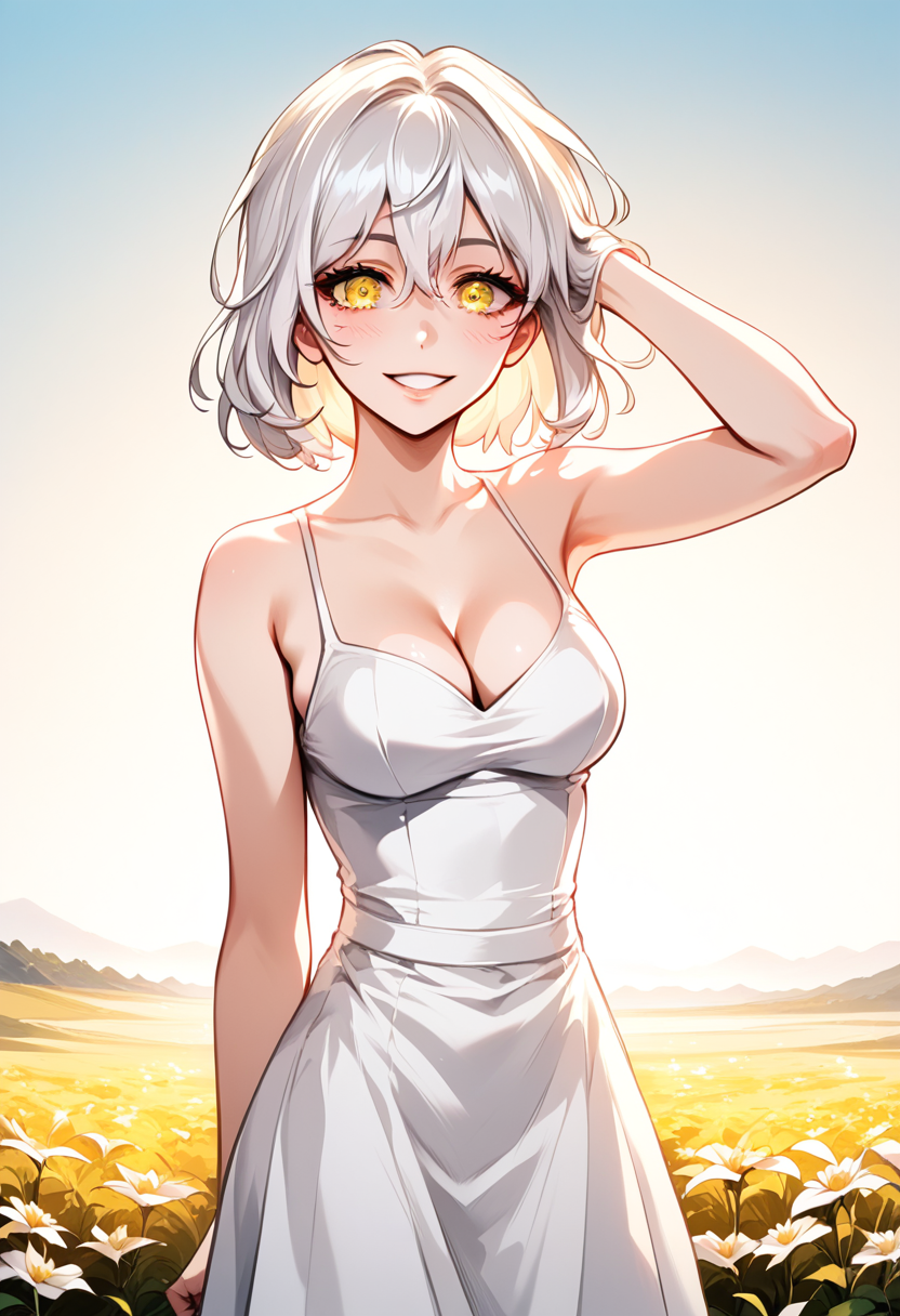 성인 외모를 위한 트리거 단어: friacis, 흰 머리, 노란 눈, 풀어진 머리, 중간 길이 머리, 성인, 웹툰, 만화, 중간 크기 가슴