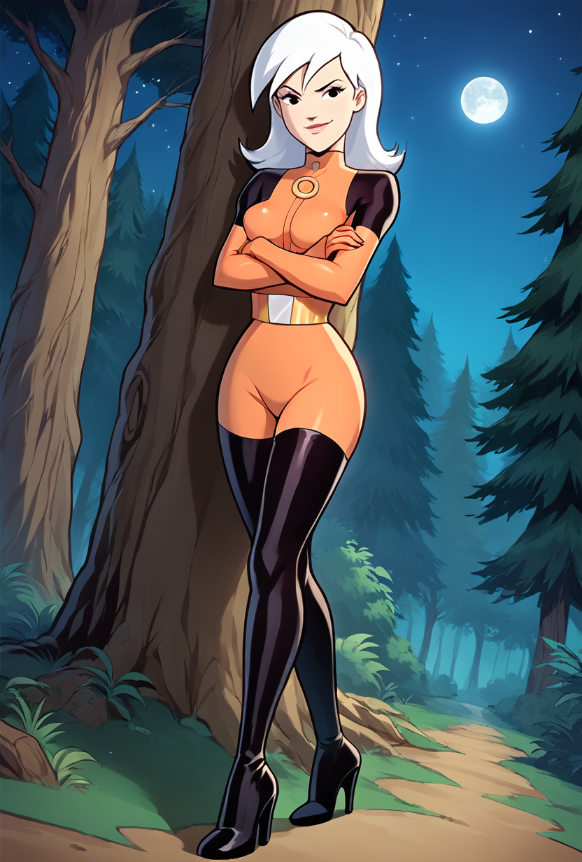 주요 태그: Drew, 하얀 머리카락, 1소녀, 바디수트, 엘보 장갑, 주황색 장갑, 하이힐, 검은 허벅지 스타킹