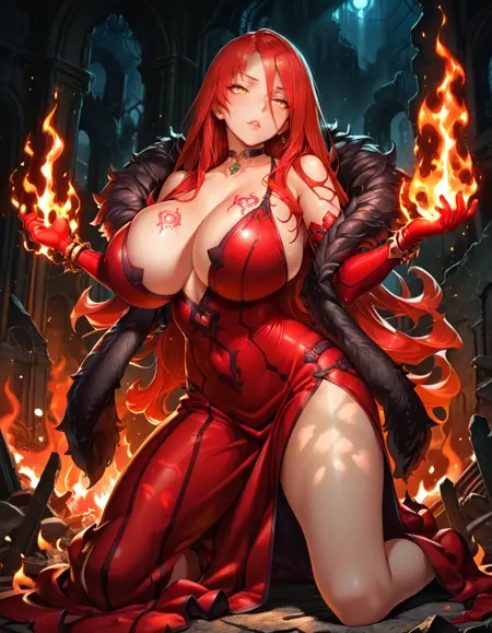 red dress, fur trim, bracelet, elbow gloves, choker, breast tattoo, feather boa, side slit,